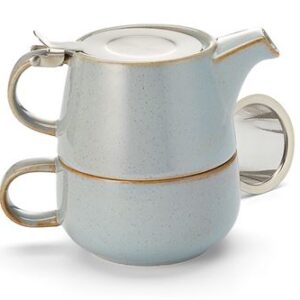 Een volledig theesetje met ondertas, tas en theekan, handig op elkaar stapelbaar.