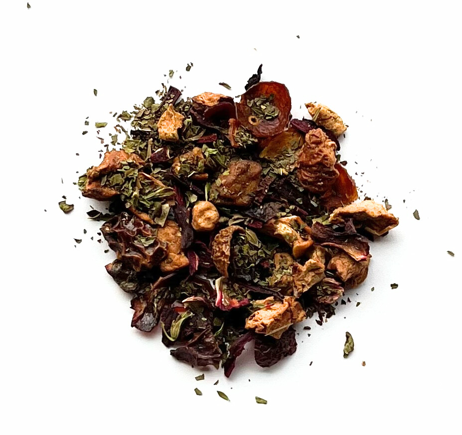 Een verfrissende dorstlesser met gedroogde appelstukjes*, natuurlijke olie van zongerijpte appelsienen*, echte Marokkaanse munt* en een toets van fijne melisseblaadjes*.