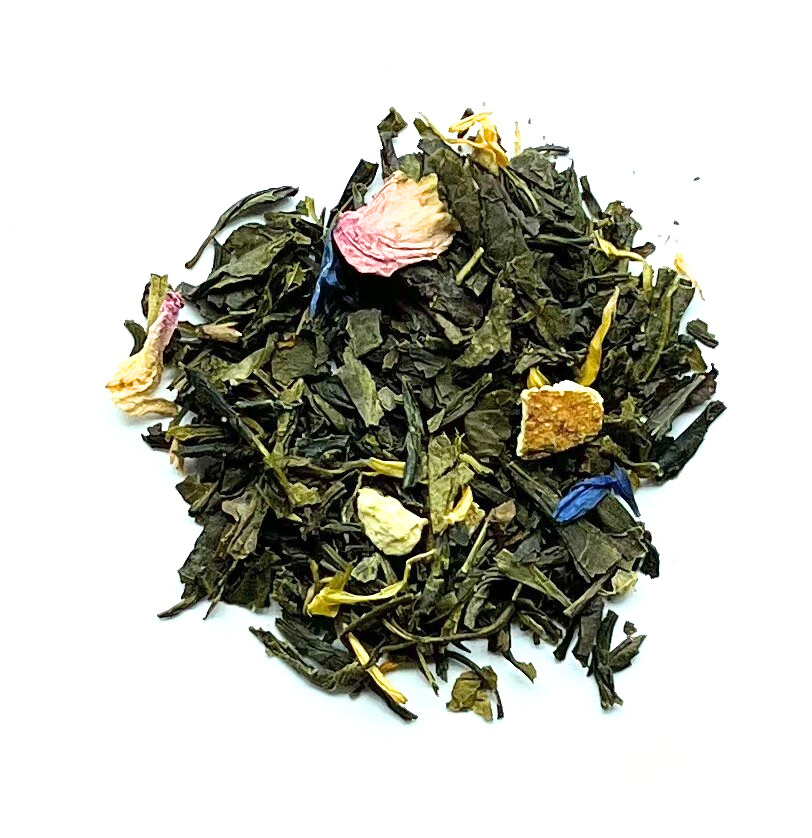 Ingrediënten: Groene thee Sencha* (china), sinaasappelschil*, goudsbloem*, vanille-extract*, rozenblaadjes*, korenbloem*, natuurlijk aroma van sinaasappel* en vanille*.