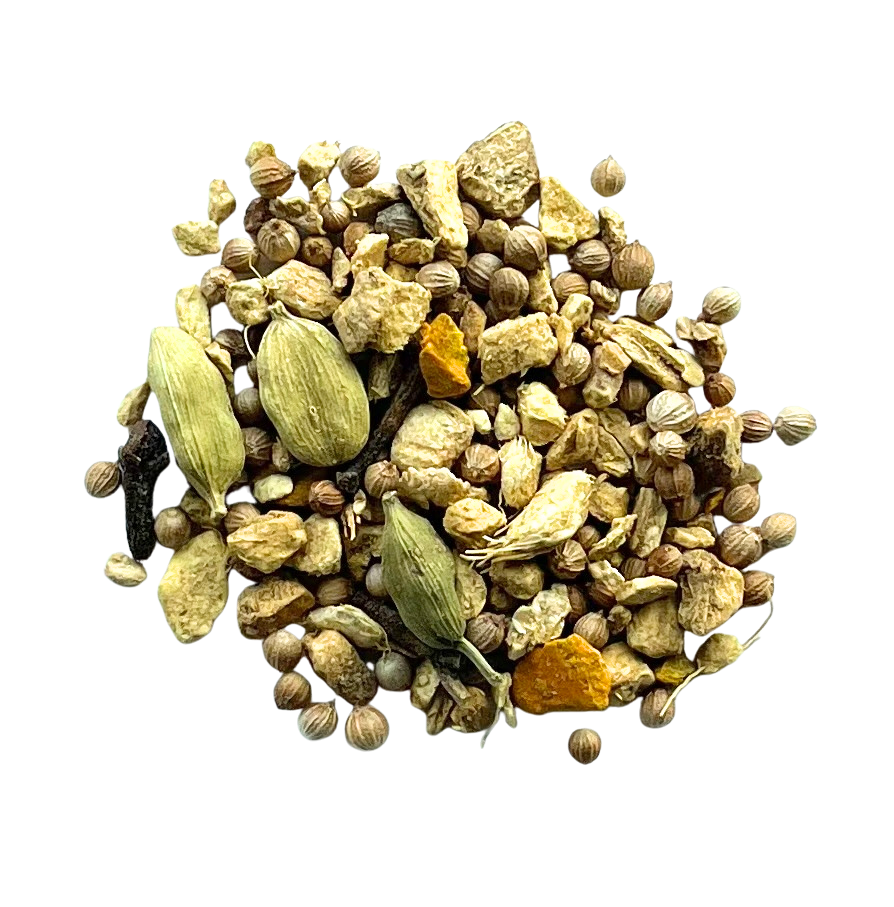 Vitaliserende ayurvedische mengeling (Kapha) met 7 sterke ingrediënten. De kurkuma, een belangrijk ingrediënt van Indische “curries”, geeft deze mengeling haar herkenbare smaak. Samen met de andere kruiden zorgt deze drank voor een dosis energie en temperament. Met gemberstukjes, koriander, kardemom, kurkumawortel, kruidnagel, muskaatnoot.