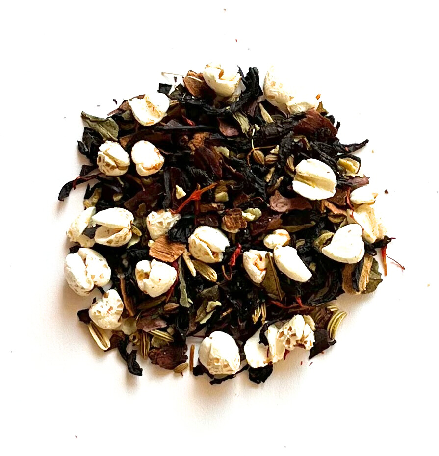 Met zwarte thee*(28%), anijszaad*, venkel*, cacaoschil*, kokos*(10%), kaneelstukjes*, quinoavlokken*(8%), gepofte boekweit*(8%), braambesblad*, saffloer, natuurlijk specerij-aroma en natuurlijke Tonka-aroma.