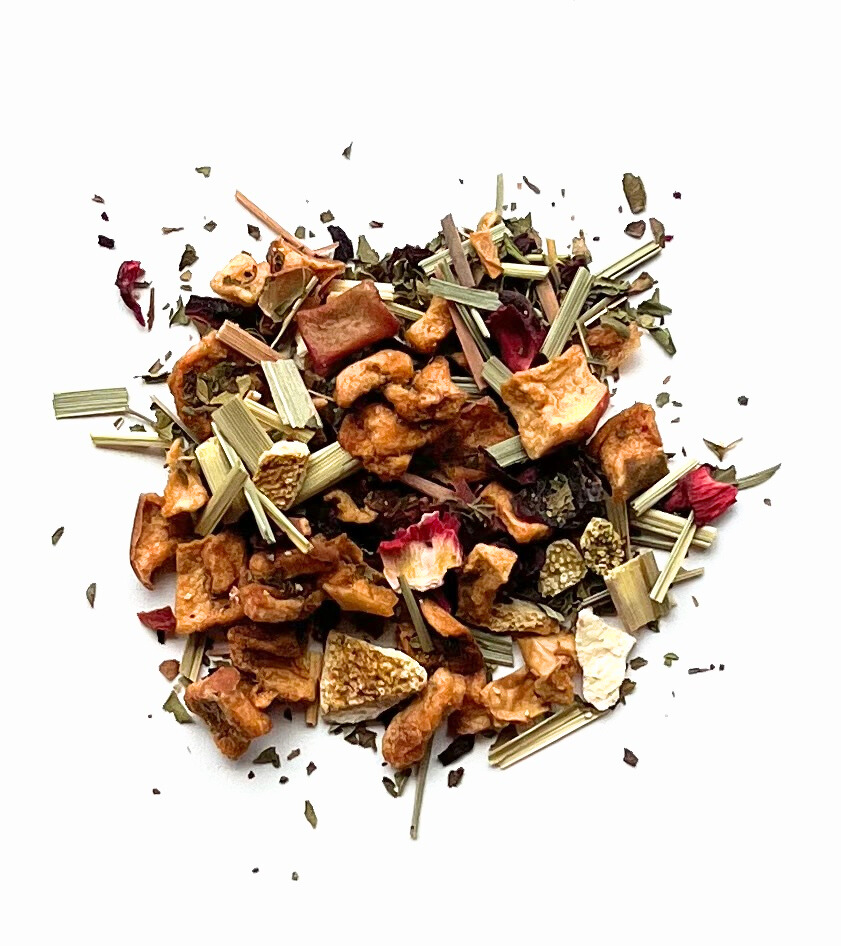 Verfrissende infusie. Heerlijk zowel koud als warm. Appel, rozenbottel, hibiscus, citroengras, sinaasappel en munt.